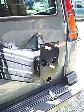 To be able to fit a 305/70R16 on the rear door of the Discovery II we have fabricated a mount that bolts to the existing tire carrier with no modifications.