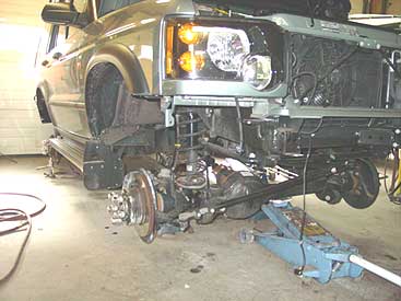 Here you can see the rear shocks have been mounted. The tests on the RTI ramp showed that the shocks needed a different mounting location than the stock Disco offered, so we fabricated a set of drop mounts for the frame of the Rover and welded them into place. This allows the shock to travel in the correct location and gives the max extension and compression for both on and off road uses.