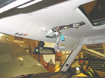 To control the ARB air lockers on the Disco we have fabricated a small overhead pod that blends in with the factory overhead pieces. Here you can see that we have relocated the interior light on the factory panel a few inches and fabricated a spacer so that when it is installed it will not touch the sunroof motor (green arrow) underneath it. We then fabricated a small pod that holds the switches for the air locker system that mimics the look of the sunroof control panel for a nice clean install. The locker switches will now be within easy reach, they look like a factory addition and they don't cause problems with any other system.