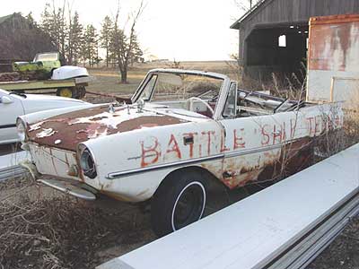 Hmm... my "new" Amphicar is grey primer... it is a boat... its German... that beater Amphicar behind Dave's had "Battleship" written on it... I got it! The new name for the Amphicar is: Bismarck (at least until I get it restored). That or I need to spend less time alone in this truck.