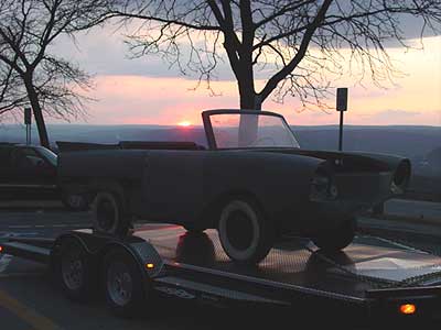 Home seeking missile mode means fewer pictures too, but I could not resist this "sunset over the Amphicar" shot just across the border in New York on Saturday evening. The weather was calling for some serious lake affect snow so I took a more southerly route home through PA and CT to try to avoid the snow and wind of Buffalo and Rochester. My plan worked just right. I had tons of wind, fortunately it was behind me and a few times I thought the cap was going to blow off the truck, but everything was cool and I didn't see any snow until I crossed the border in MA. Then like a Hollywood director yelling "cue the snow machine" the snow came down and made it virtually impossible to see, and as much as I like driving in bad weather (don't ask... its a sickness) I had to pull over and find a motel near Sturbridge MA, it just wasn't safe with the trailer.