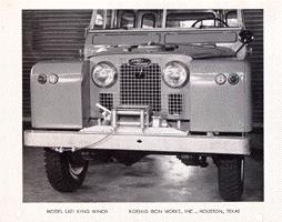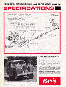 Much like today, where the owners of new Defender 90s and Discoverys add numerous options to personalize their Rovers, vintage Rovers had numerous options that could be added. However most of these options related to "work" and not so much towards "flash" as in today's market. We have all seen the Defender 90 that has every option for off road use, when unfortunately the closest it gets to off road are the speed bumps in the mall parking lot. One of the popular, and now sought after, vintage Rover options was the PTO (Power Take Off, meaning engine driven) winch made by Koening Iron Works, Inc. in Houston, Texas. Below are images of the original 1960's Koening brochures.