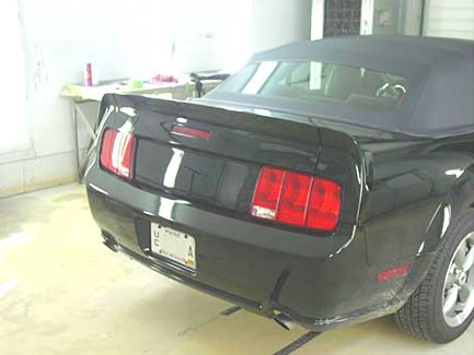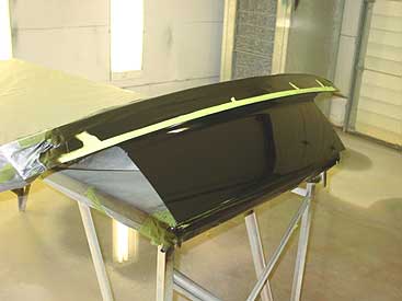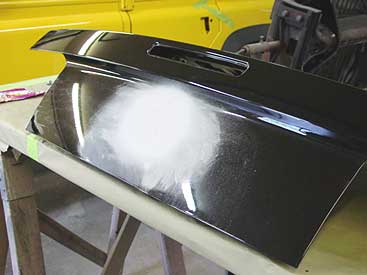 Here is the trunk lid after paint and 3 coats of clear. It now has no key hole and no "GT" logo. Once it is baked we'll put it back on the car.