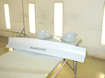 Here you can see the new spoiler has been test fit to the car and modified a little, and now it is getting prep'd and painted (now under primer). Next we'll block out the spoiler to get rid of the small imperfections so that the finish paint is spot on.