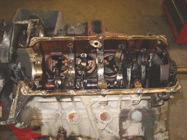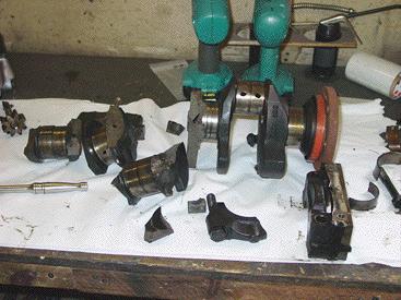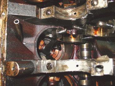 Check out those main bearing surfaces and the twist in that connecting rod. Yikes.