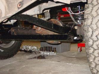 Underneath the Rover the news is better. In this image you can see that the freshly fabricated ECR ROX parts have now been primed, painted and installed. The modified radius arm, the tie rod guard and the Stage II suspension are all in place and looking good.