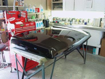 Here you can see the LWB just out of a bake cycle with its last coat of clear applied over numerous coats of primer and base coat black. The Range Rover now shines better than the day it was new and the new paint will last longer than the factory paint. The next step will be to paint the new hood and the roof section to match the body in the deep Black.