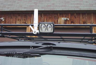 At the rear of the roof rack we fabricated a bracket that holds the Hella twin bulb rear work light and the XM radio antenna. The antenna can be folded down for space to get into those low parking garages, or when off roading where a heavy tree limb might damage it, and the light is placed so that tree limbs will not harm it off road.