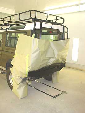 Here you can see the rear cross-member getting its 3 coats of epoxy primer and then 3 coats of PPG paint for a long lasting repair. Once the paint has cured in the bake booth we will re-install the rear step/tow bumper.