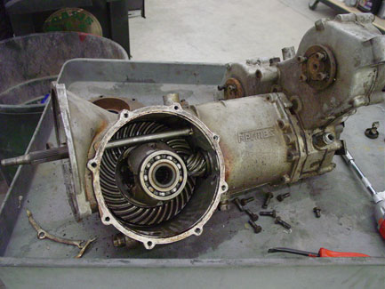 With the engine and transaxle out I can breath easy because when I drained the gear oil no water was present. Digging a little deeper to take a peek inside, I can see that everything looks good. The gears and bearings are all in good shape with no rusting, pits or damage. Poking around in web recently I have seen transaxles selling for more than I paid for the entire project, so I'm very relieved to know that this unit will just need a little work and not replacement.
